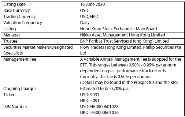 1. Investment involves risks. Past performance or any prediction, projection or forecast is not indicative of future performance. The value of units and income from them may fall or rise. Investments in the Sub-fund is subject to investment risks, including the possible loss of principal amount invested. You should read the Prospectus and Key Facts Statement for details including the risk factors and the arrangement in the event that the Sub-fund is delisted. Investors should also note that the Sub-Fund is different from a typical unit trust and units may only be created or redeemed directly by a participating dealer in large creation or redemption units. This document is issued by Nikko Asset Management Hong Kong Limited and has not been reviewed by the Securities and Futures Commission.